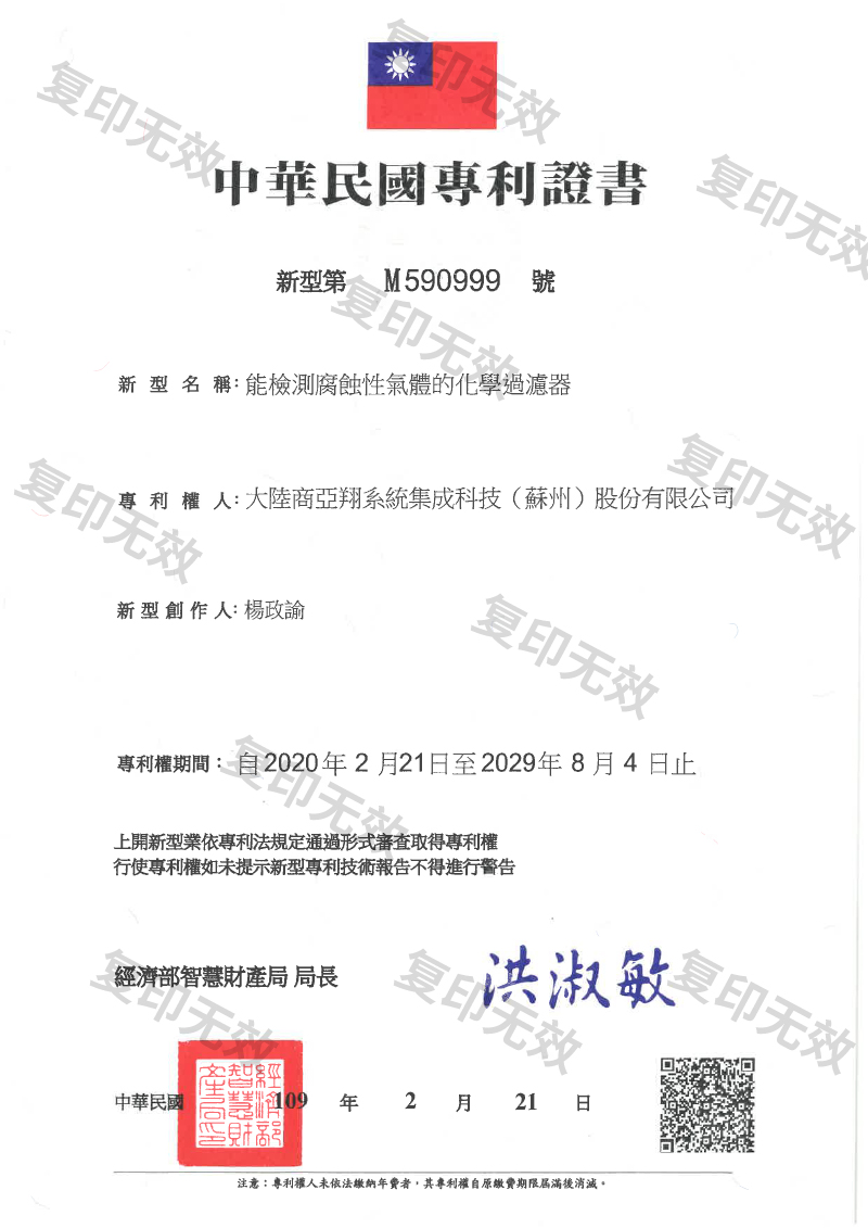 能檢測腐蝕性氣體的化學過濾器(臺灣)