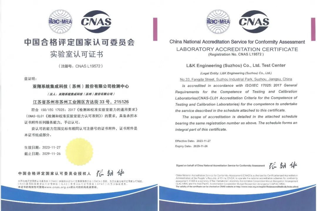 近日,亞翔系統集成科技(蘇州)股份有限公司檢測中心,順利通過CNAS的評審,并獲得CNAS實驗室認可證書(注冊號:CNAS L19572)。