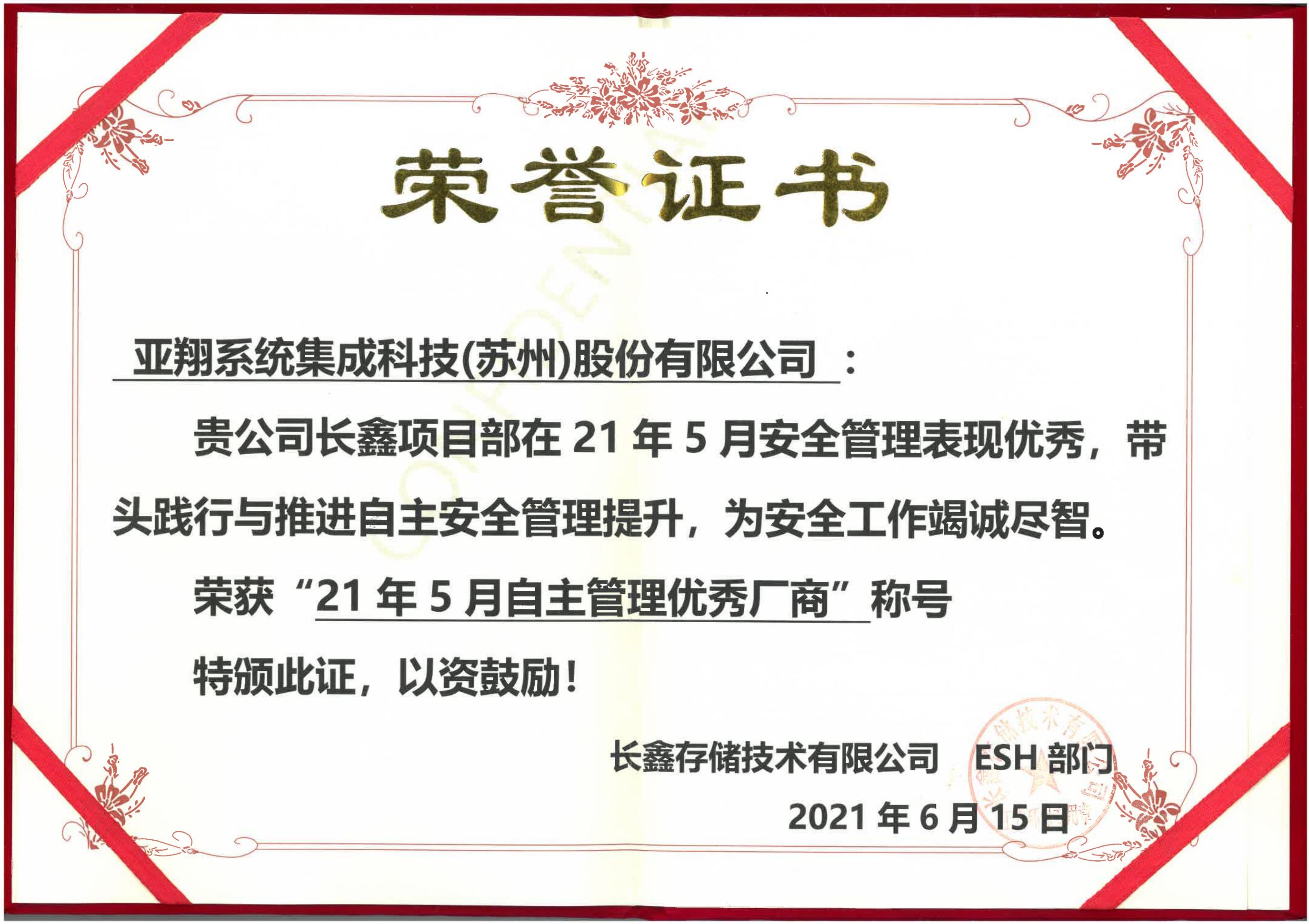 2021年5月獲自主管理優(yōu)秀廠商榮譽(yù)證書