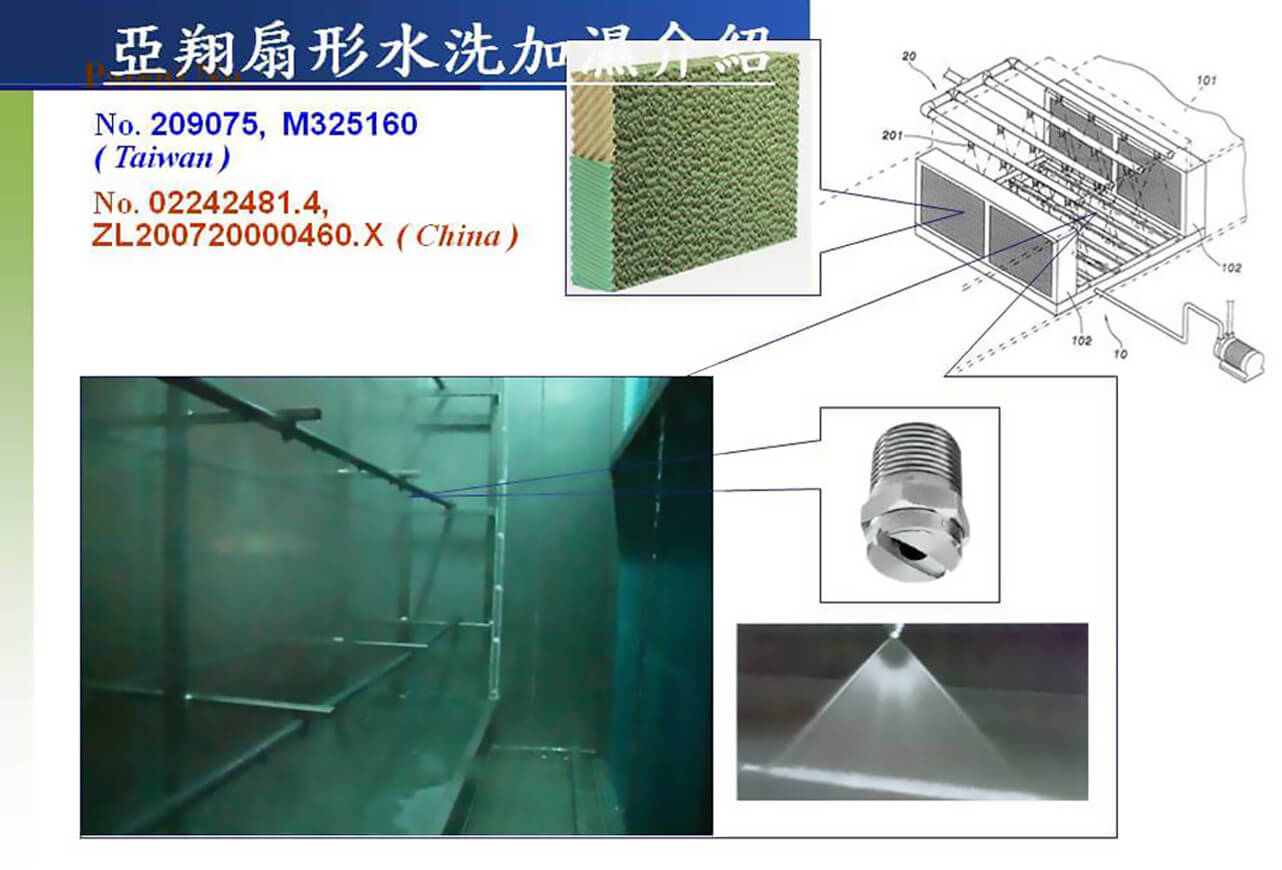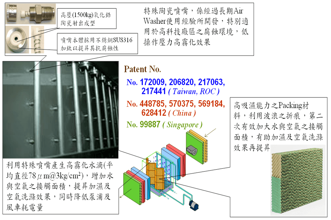 本系統(tǒng)具有中國大陸之專利,其主要應(yīng)用系安裝于外氣空調(diào)箱以提供低初設(shè)成本、低耗電量、耗水量之空氣無機(jī)性氣體洗滌移除及加濕雙重功能。