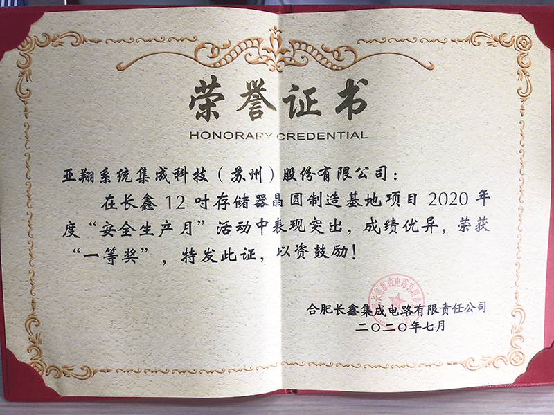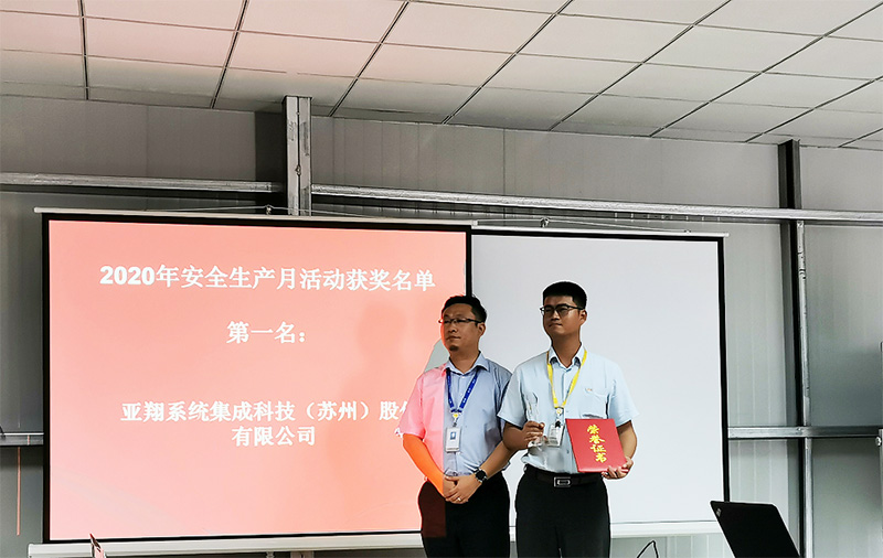 亞翔集成喜獲長鑫集成2020年度安全生產月評比一等獎