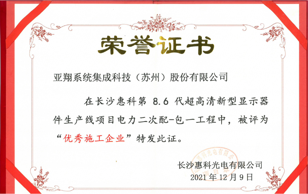 在整個施工過程中,專案團隊人員實行精細化管理,對重難點的施工,積極會同惠科光電專業工程師溝通討論並確認方案,嚴格執行公司安全品質管理標準,保質保量順利完成專案節點目標;後續電力二次配系統運行平穩,得到了業主的肯定和讚譽,並獲得了業主頒發的“優秀施工企業”榮譽證書,在此由衷的感謝長沙惠科光電對亞翔集成的認可!